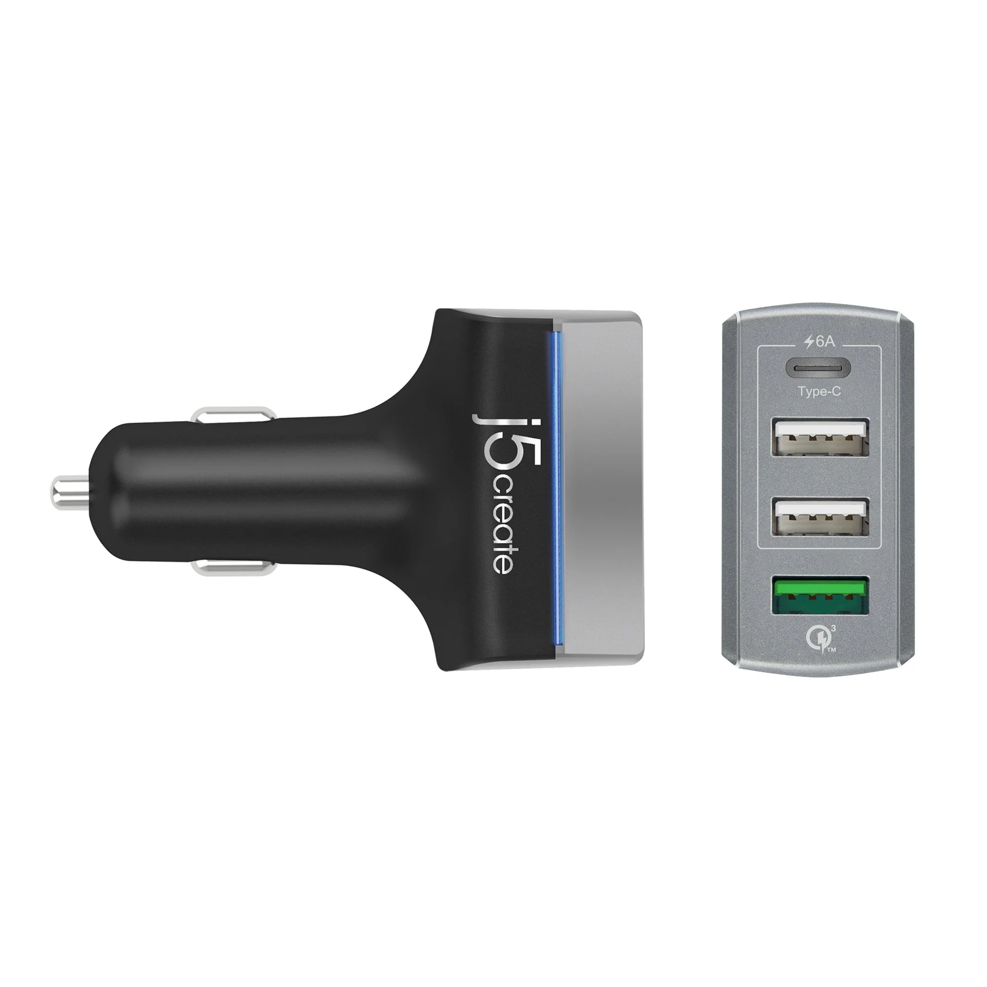 The JUPV41 4-Port USB™ QC™ 3.0 & USB Type-C™ Car Charger provides multiple ports, giving you the ability to charge up to 4 devices simultaneously. One port is equipped with Qualcomm® Quick Charge™ 3.0 support, allowing you to charge your QC™ 3.0 compatible smartphone 4x faster than a standard charger. One port is the USB Type-C™ standard, it allows you to charge your device at up to 3A. The other two ports come with a standard USB™ port, giving you the ability to simultaneously charge other device(s) at up to 2.4A. The charger also comes with surge protection, protection from overcharging, overcurrent and overheating, keeping your devices safe.